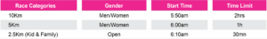 – Event formats: 10k, 5k, and 2.5k fun run (for families and children)